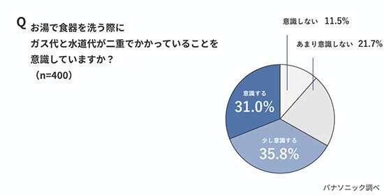 お湯で食器を洗う際に、ガス代と水道代が二重にかかっていることを意識しているかを尋ねた質問では、「意識する」と「少し意識する」を合わせた割合が6割超に達している。