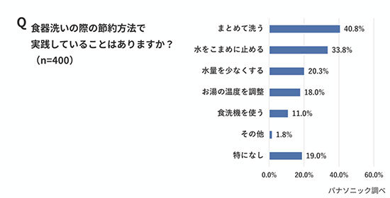 食器洗いの際の節約方法で、実践していることとしては(複数回答)、「水をこまめに止める」(33.8%)が最多となっている。