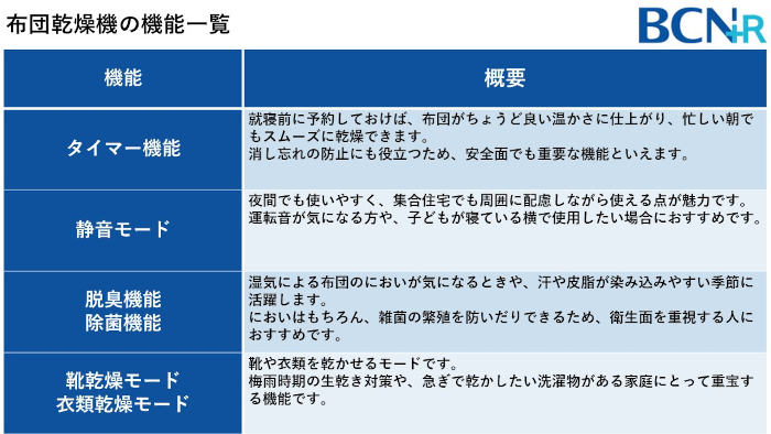 布団乾燥機を選ぶ際は、乾燥性能だけでなく「プラスαの機能」にも注目すると、使い勝手が大きく向上します。
