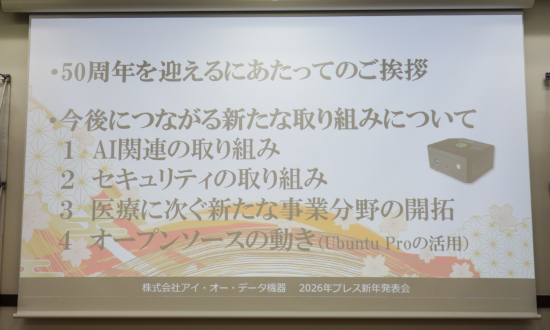 アイ・オー・データ機器は1月8日、創業50周年を記念するプレス新年発表会を開催した。細野昭雄代表取締役会長はあいさつで、AI関連やセキュリティーなど今後の四つの取り組みについて語った。また、業界に先駆けて発売した携帯オーディオプレーヤー「HyperHyde」で、1999年~2000年にイメージガールを務めた俳優の釈由美子さんとやまだひさしさんによるスペシャルトークも開催して会場を盛り上げた。