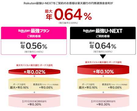 楽天銀行の円普通預金の金利優遇プログラムである「ボーナス金利」を拡充し、楽天銀行の口座を保有する楽天モバイル契約者が所定の条件をすべて満たした場合に、「Rakuten最強U-NEXT」の場合は年0.10%(税引後 年0.079%)、「Rakuten最強プラン」では年0.02%(税引後 年0.015%)を上乗せする。ボーナス金利と楽天証券との口座連携サービスである「マネーブリッジ」による優遇金利とあわせると、円普通預金金利は2月1日の金利引き上げ後、上限1000万円まで最大年0.64%(税引後 年0.509%)となり、通常金利と比べて2倍以上もお得になる。