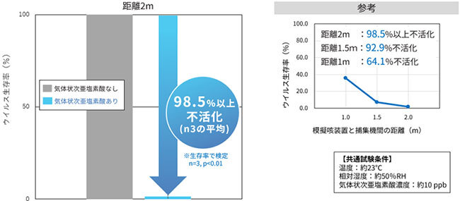 今回使われたのは、低濃度の気体状次亜塩素酸(約10ppb)。これが飛沫の水分に急速に溶け込み、濃縮された状態でウイルスへ作用することで秒単位で不活化が進むとみられている。そのため、家庭内感染の連鎖を断ち切る手段になる可能性がある。