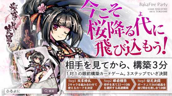 「桜降る代に決闘を」は、BakaFire Partyが展開している、眼前構築型決闘ボードゲーム。神座桜と呼ばれる特別な力を持つ桜と、そこに「メガミ」と呼ばれる存在が宿る世界において、プレイヤーはメガミの力を借りて決闘を行う。ゲームが始まる前に、プレイヤーは多様なメガミたちの中から2柱を選んで、それぞれに割り当てられたカードを受け取る。その後、相手の選択したメガミを確認した上で、受け取ったカードの中からデッキを構築する。
