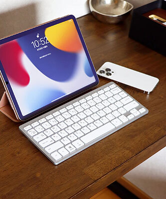 「Bluetoothキーボード」は、スマートフォンやタブレットとBluetooth接続して使用可能なキーボードです。使用には単4乾電池2本が必要で、対応OSはWindows7以降、macOS・iOS・iPadOS・Androidなどに対応しています。コンパクトで薄型のため、持ち運びに便利です。シンプルなホワイトデザインで、カフェやオフィスなど場所を選ばず使用できます。