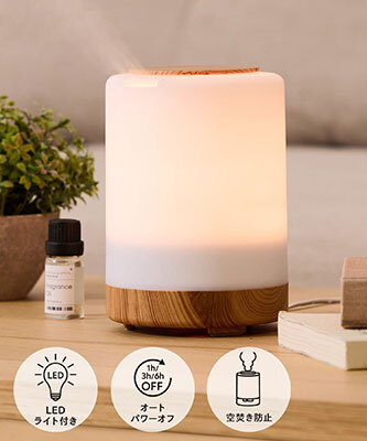 「アロマ加湿器」は、タンクに自分好みの水溶性アロマオイルを入れて香りと加湿を同時に楽しめるアイテムです。ミストが常時出る2つのモード(連続モード強・弱)と、一定の間隔でミストが出る「間欠モード」の3モードを搭載しています。