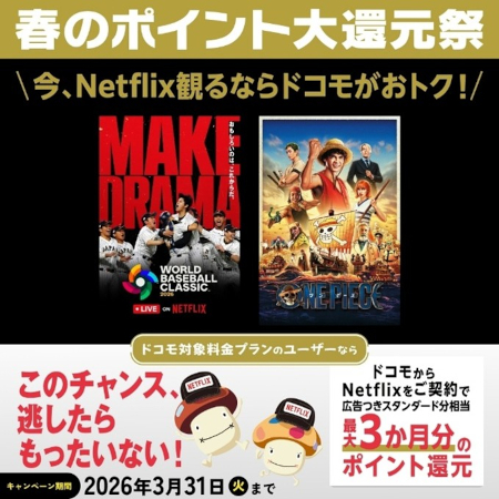 NTTドコモとNetflixは1月23日、ドコモの対象プラン(ahamoを含む)の契約者を対象に「ドコモ×Netflix 観るなら今!春のポイント大還元祭」を3月31日まで実施している。