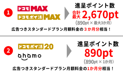 ドコモの契約プランによってポイントを進呈する月数が変わり、「ドコモ MAX」「ドコモ ポイ活 MAX」の場合は3カ月分相当(計2670ポイント)、「ドコモ ポイ活 20」「ahamo」の場合は1カ月分相当(890ポイント)となる。ポイント進呈時期は6月以降(予定)。また、同キャンペーンによるdポイント(期間・用途限定)の進呈は1人につき1回限り。