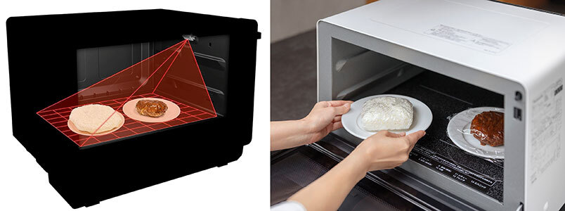 FB2Dは単機能レンジだが、同社のスチームオーブンレンジのフラッグシップモデルで採用している高精細・64眼スピードセンサーを搭載している。同センサーは庫内全体を0.1秒でセンシングし、食品の温度や分量などを見分けてムラなく、自動であたためと解凍を行う。