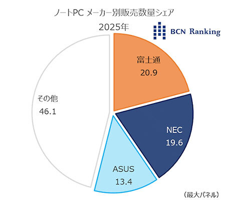 このようなノートPC市場で、25年の年間No.1となったのは富士通クライアントコンピューティング(FCCL)で、シェアは20.9%だった。FCCLは前年のノートPC部門でAWARDを初めて獲得。また、デスクトップPC部門でもAWARDを獲得しており、2年連続してパソコン2部門での獲得となった。NECパーソナルコンピュータは、首位のFCCLと1.3ポイント差の19.6%で2位。ASUSは13.4%の3位となった。