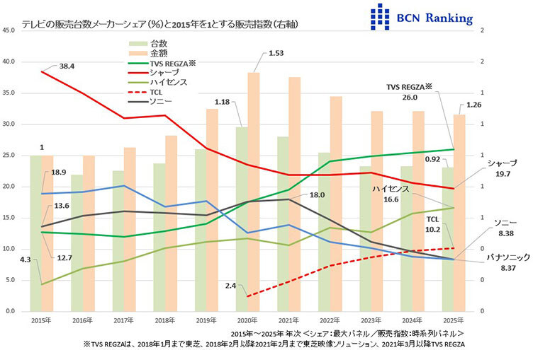 東芝、シャープと来て、今回のソニー。日本のテレビ事業で国内資本だけで成り立っているのはパナソニックだけになってしまった。そのパナソニックですら、パネルは海外からの調達。テレビ事業の構造は大きく変化した。一方で販売は踏ん張っている。15年のテレビ販売を1とする指数では、25年は台数で0.92と7.5%減。金額では1.26で、むしろ伸びている。いずれもコロナ禍特需のピークだった20年に比べれば減少した。しかし、テレビ放送がオワコン化する中、ネット動画の視聴にも活躍するハードウェアとしてのテレビ自体は、まだまだ堅調だ。ただ、これからのテレビで重視される要素はこれまでと異なってくる。映像の美しさは必要条件。加えて明暗を分けるのは、ネットコンテンツの検索能力や操作のスピード感といった、テレビ放送プラスアルファの機能の優劣。そこで、テレビの頭脳を担う日本陣営の実力が試される、という構図になってくるだろう。(BCN・道越一郎)