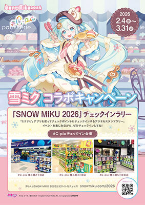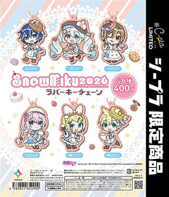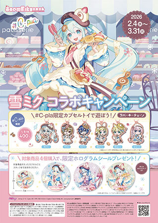 「#C-pla」の北海道店舗限定で開催されるコラボキャンペーンでは、限定商品として「#C-pla限定 SNOW MIKU 2026ラバーキーチェーン」(1回400円、全6種)を先行発売する。