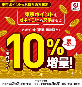 - 「東京ポイントからdポイントへの交換で+10%もらえるキャンペーン」=https://dpoint.docomo.ne.jp/cp_7/tokyoto_260201_7178/index.html