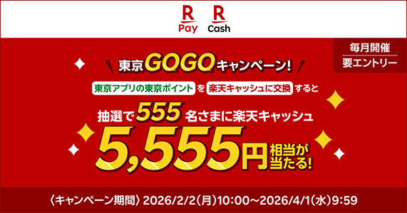 一方、楽天ペイメントは、同事業にあわせ、抽選で555人に5555円相当の楽天グループのオンライン電子マネー「楽天キャッシュ【基本型】」を進呈する「【楽天ペイ主催】東京ポイントを交換するなら楽天ペイ!東京GOGOキャンペーン!」を実施する。エントリー必須で、キャンペーン期間は2月2日~4月1日。