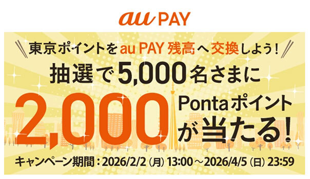 KDDIとauペイメントが提供する「au PAY」も、東京ポイントをau PAY残高に交換すると抽選で5000人に2000円相当のPontaポイントが当たる「au PAYで東京ポイント交換キャンペーン!」を実施する。対象は期間中に東京ポイントを3000ポイント以上交換した人。キャンペーン期間は2月2日~4月5日。
