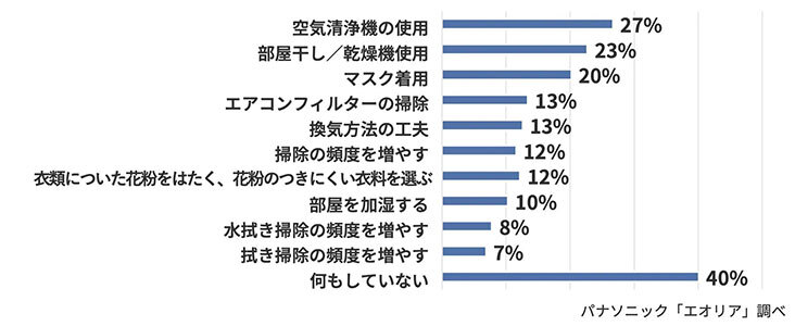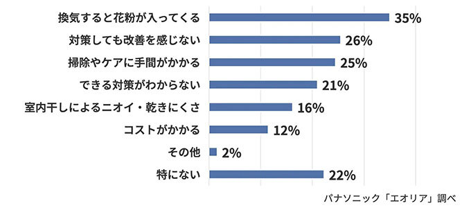 室内での対策については、「空気清浄機を使用している」(27%)、「部屋干しや乾燥機を使う」(23%)など一定の工夫が見られる一方、「何もしていない」と答えた人が40%にのぼったとのこと。困りごとは、「換気すると花粉が入ってくる」(35%)、「対策しても効果を感じない」(26%)、「掃除やケアに手間がかかる」(25%)といった声が上位を占め、「対策したいが、正解がわからない」という迷いが浮き彫りになっている。