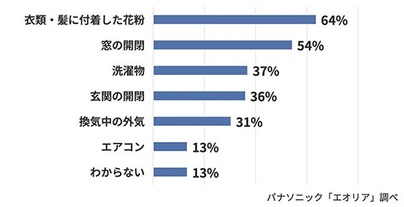 調査では、13%が「エアコンが花粉の侵入経路」と誤解しているという。しかし、一般的な換気機能のないエアコンは室内の空気を循環させているだけで、エアコン自体から花粉が入り込むことはない。花粉の主な侵入経路は、「人やペットの体に付着」や「玄関や窓の開閉」「外干しした洗濯物」とされており、「どう持ち込まないか」が対策の要とのことだ。