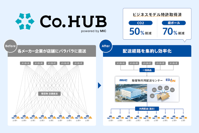 エディオンは、店舗運営の業務効率化、取引先の物流負荷軽減と環境負荷低減を目的として、MICが提供する販促物共同配送プラットフォーム「Co.HUB」と店舗販促物オーダーシステム「Promo Store(プロモストア)」を、2026年4月から導入する。