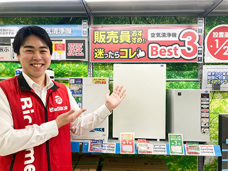 毎年の花粉にお悩みで、空気清浄機選びで迷っている人は、笑顔が素敵な村上さんに気軽に声をかけて相談してみましょう。