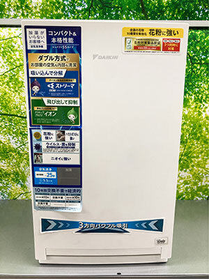 「独自のストリーマとアクティブプラズマイオンのダブル方式で、花粉やハウスダスト、においにも強いです。また、従来よりも高さを抑えたコンパクトなデザインが特徴です」。