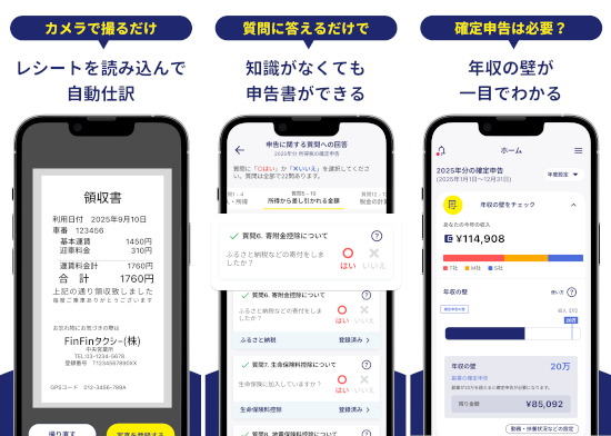 「スマホ会計FinFin」は、スマートフォンだけで簡単かつ全自動で確定申告を完結できることをコンセプトに開発された会計アプリ。銀行APIやAI-OCRを駆使して仕訳を可能な限り自動化するとともに、確定申告初心者でも簡単に最後まで到達できるよう、独自の対話型UXUIを搭載している。