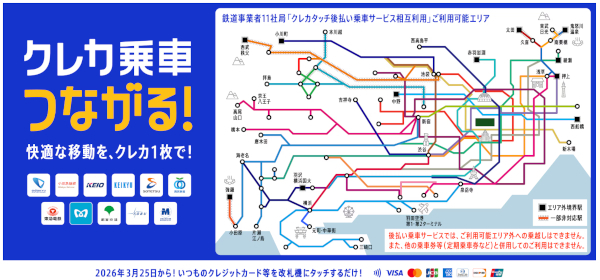 関東の鉄道事業者11社局(小田急電鉄、小田急箱根、京王電鉄、京浜急行電鉄、相模鉄道、西武鉄道、東急電鉄、東京地下鉄、東京都交通局、東武鉄道、横浜高速鉄道)とオムロン ソーシアルソリューションズは、「タッチ決済」に対応したクレジットカードや、同カードが設定されたスマートフォン(スマホ)などで、対象の鉄道事業者間を相互に乗り継いで利用できるサービスを3月25日から開始すると発表した。Suica・PASMOなどの交通系ICには改札通過時の速さという絶対的なメリットがあり、今後も主軸と位置づけたうえで、鉄道事業者間の連携をさらに進め、後払い乗車サービスの相互利用が可能な鉄道ネットワークの拡充を図っていく。