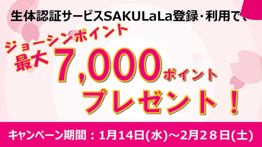 今回のキャンペーンでは、SAKULaLaに新規会員登録し、指認証の登録とジョーシンカードの紐づけを行うと当日から使えるジョーシンポイント1000ポイントをプレゼントする。加えて、SAKULaLaでジョーシンカードを提示の上、1回1万円以上購入すると、次回から使えるジョーシンポイント2000ポイントをプレゼントする(1日1回、期間中3回まで)。なお、生体登録時には本人確認書類(運転免許証・運転経歴証明書・マイナンバーカードのいずれか)が必要。また、26年1月現在、指認証でのポイント付与・利用のサービスは他の店舗では利用できない。