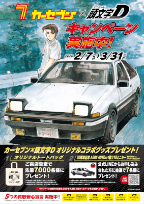 カーセブンデジフィールドは2月7日~3月31日の期間、同社の展開する中古車買取チェーン「カーセブン」の全国店舗において、漫画「頭文字D」とのコラボレーションによる「カーセブン×頭文字Dコラボキャンペーン」を開催している。