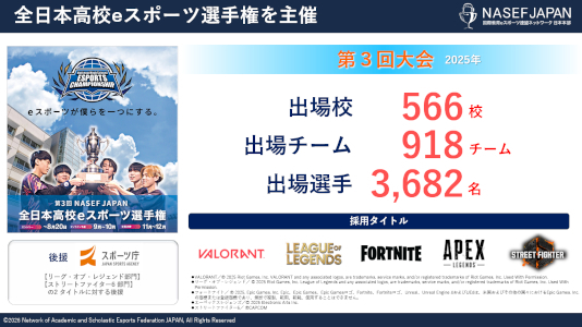 主な活動として有名なのは、全日本高校eスポーツ選手権の主催だ。スポーツ庁が後援する大会で、25年に開催した第3回大会には566校、918チーム、3682名の高校生が参加した。