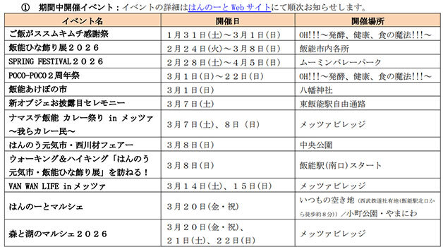 3月7日には東飯能駅自由通路で「新オブジェお披露目セレモニー」、3月20日にはメインイベントとなるマルシェ「はんのーとマルシェ」を開催する。また、3月7日・8日の2日間、「ナマステ飯能 カレー祭り in メッツァ~我らカレー民~」の名称で昨年好評だったフード中心のイベントをメッツァビレッジで初開催する。マルシェイベントはいずれも入場無料。