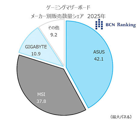 次に、ゲーミング液晶ディスプレイとゲーミングマザーボードの2部門でAWARDを獲得したASUSの状況をみる。ゲーミング液晶ディスプレイでは12.6%のシェアで2位のMSIと1.7ポイントの僅差でのAWARD獲得。ゲーミングマザーボードでも2位のMSIとは4.3ポイント差であったが、42.1%のシェアを占めた。