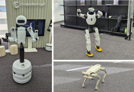 コミュニケーションロボットの横に設けられたのはサイボーグとヒューマノイドのコーナーで、最近話題のフィジカルAIを体現した各種のロボットが展示されている。