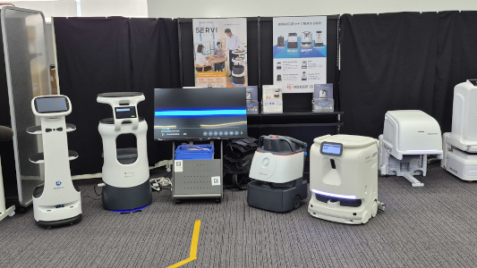 クリーニングコーナーに配置された各種の清掃・配膳ロボット