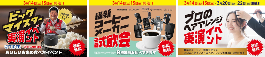 開店を記念し、3月14日から、5000円以上の同社指定商品の購入者を対象としたビックカメラが開発した「乾燥機を使う人のためのフェイスタオル」の先着プレゼント(なくなり次第終了)や、店内のキーワードを集めてもらえる話題のグミのプレゼント(各日先着500人)など、多彩なオープニングイベントを開催する。さらに、プロのヘアメイクアーティストによる最新美容家電を使ったヘアアレンジの実演、「お米ソムリエ」の資格をもつビックカメラマイスター販売員による炊飯器の炊き比べ、最新コーヒーマシンの試飲会など、各フロアの特色を活かした体験型企画を実施する。