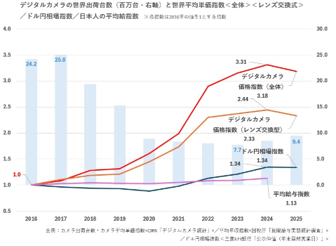 カメラ映像機器工業会(CIPA)の集計によると、この10年、カメラの世界出荷台数は半分以下に縮小した。2016年は2420万台だったが、昨年は940万台だった。ただ、770万台を記録した23年で底を打ち、徐々にではあるが回復基調にある。一方で単価の上昇は激しい。16年の2万9400円から昨年は9万3300円まで、3倍以上に急上昇している。レンズ交換型が増えた、というのが理由の一つだ。出荷台数構成比は16年の48.0%から、昨年は74.2%まで上がってきた。しかし、レンズ交換型に限った単価を見ても、16年の4万4800円から10万4100円と2倍以上に跳ね上がっている。16年を1とする指数にすると、カメラ全体の単価は昨年には3.18、レンズ交換型では2.33まで上昇した。折からの円安を単価上昇の要因とするメーカー関係者も多い。しかし、ドル円相場の指数では、16年から昨年では1.34と3割強の上昇にとどまっている。一昨年までのデータしかないが、平均給与に至っては、1.13と1割強しか上がっていない。