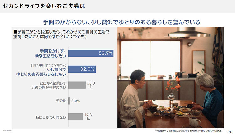 子育てを終えたセカンドライフ夫婦に聞いた同社のアンケートでは、「手間をかけず、楽な生活をしたい」と回答した人は52.7%、「少し贅沢でゆとりのある暮らしをしたい」は32.0%だった。