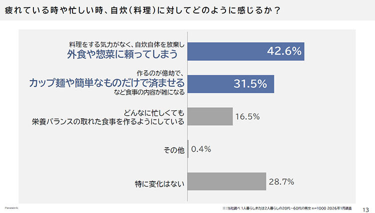 パナソニックの調べでは、疲れている時や忙しい時に「外食や総菜に頼ってしまう」という人が42.6%、「カップ麺や簡単なものだけで済ませる」が31.5%となっている。外食や総菜の頻度が増えれば、コスパも悪くなるし、栄養バランスも心配だ。