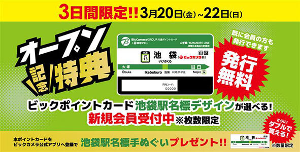 ビックカメラは、「ビックカメラ池袋西口 IT tower店」のオープンを記念し、ビックポイントカード「池袋駅名標デザイン」を3月20日から22日までの3日間限定で発行する。