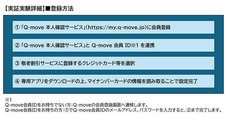まず「Q-move本人確認サービス」に会員登録を行い、Q-moveの会員情報と連携する。次に敬老割引に利用するクレジットカードなどを登録し、専用アプリをダウンロードしてマイナンバーカードを読み取ることで設定が完了する。この手続きが完了したカードをバス車内の専用端末にタッチすると、運賃が自動的に優待料金で計算される仕組みだ。なお、この敬老割引に関しては、スマートフォン(スマホ)のタッチ決済は対象外。
