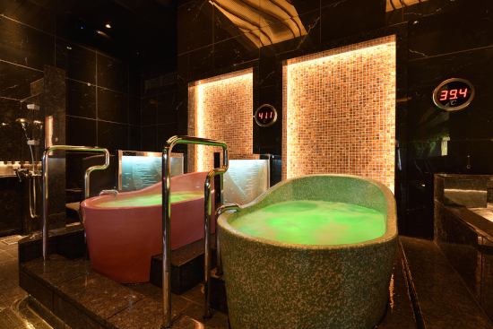 温冷交代浴に欠かせない「熱湯」をはじめ、自分だけの贅沢な時間を楽しめるパーソナル湯舟「美泡の壺」、浴槽全体から湧き出す無数のミクロの泡が肌をやさしく包み込む「泡の湯」といった、さまざまなお風呂を楽しめる。