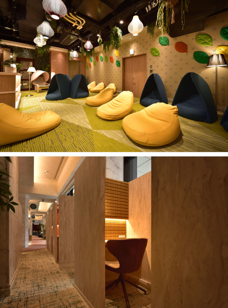 さらに、サウナ後のクリアな思考状態を活かして、そのまま仕事へと移行可能な新しいワークスタイルを提案する空間、「WORK & REST」も用意する。壁面に自動車の防音技術を応用した吸音シート「のどかな葉」を採用することで、周囲の音を気にすることなく集中できる環境を整えており、Free Wi-Fiと電源を備えた個人ワークスペースを11席備えている。