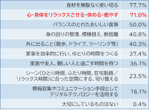 パナソニックが1人もしくは2人世帯に対して行ったアンケート調査で、日々のくらしの中で大切にしていることを聞いたところ、『心・身体をリラックスさせる・休める・癒す』を挙げた回答者は全体の71.0%。小世帯の実に7割以上が心身のリラックスやケアを重視していることが分かった。