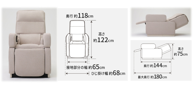 MA110は、本体サイズが大きくなりがちなマッサージチェアの課題に対して、スリムかつリクライニングチェアとしての機能にもこだわった製品である。本体はひじ掛けまでの左右幅が約68cm、奥行は約118cm(リクライニング時は最大約180cm)。約1畳のスペースに設置できる仕様となっており、搬入に関しても一般的なマンションのドア幅に配慮した設計だ。