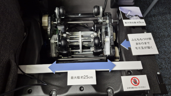 筆者も実際に体験してみた。もみ玉はこねたり、押し上げたり、揉み込んだりと多彩な動きで、体の表面のみならず深い部分までしっかりとマッサージする。筋肉が張っている部位では最初は若干の痛みを感じたが、コリがほぐれてくると心地よさに変わってきたのを自覚した。