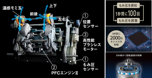 2)センサーで検知された情報はPFCエンジンⅡが1秒間に2000回の信号を発し、上下・左右・前後の動きを立体的に制御。3)もみ玉を駆動する3つの高性能ブラシレスモーターがもみ玉を細かく動かし、繊細な人の手の動きや指さばきのマッサージを実現する。