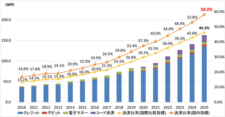 経済産業省が3月31日に発表した、日本における2025年のキャッシュレス決済比率は58.0%(162.7兆円)だった。内訳はクレジットカード82.4%、デビットカード3.4%、電子マネーが3.7%、コード決済が10.2%。決済金額をみると、1位のクレジットカードは134.6兆円、2位のコード決済は16.6兆円まで伸びており、キャッシュレス決済比率は過去最高を更新した。
