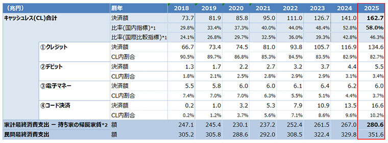 同省は当初「キャッシュレス決済比率を2025年までに4割程度にする」という目標を掲げていたが、国際指標で21年に、国内指標で24年にキャッシュレス決済比率4割超えを達成。25年12月に公表したキャッシュレス推進検討会のとりまとめに基づき、現在は、将来的な目標として国内指標でキャッシュレス決済比率80%、30年までに同65%を達成するという中間目標を掲げている。