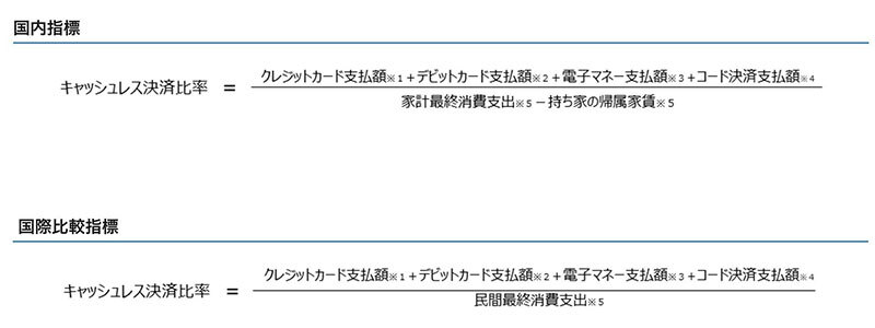 キャッシュレス決済比率(国内指標)は、クレジットカード・デビットカード・電子マネー・コード決済の支払額の合計値を、内閣府「国民経済計算」(名目)による「家計最終消費支出」から「持ち家の帰属家賃」を引いたもので割った数値。国際比較指標(国際指標)に関しては、以前のキャッシュレス決済比率の算出方法である、内閣府「国民経済計算」(名目)による「民間最終消費支出」で割った数値を用い、それぞれ定期的に算出・公表している。