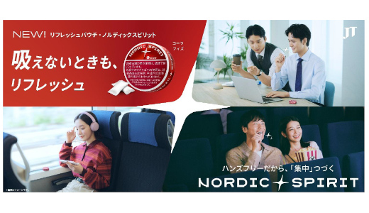 「ノルディックスピリット」は、たばこの新しいスタイルを提案するリフレッシュパウチ。口に含むだけで、贅沢な味わいを約30分間じんわりと長く楽しめ、いつでもどこでも気軽にリフレッシュできる。ハンズフリーで両手をふさぐことなく使用可能なため、目の前のことに集中でき、かつその集中が続く。また、モダンオーラル(植物由来の繊維をベースとした白色のパウチを口に含んで使用する、火を使わないオーラルたばこの一種)発祥の地であるスウェーデン製で、本場ならではの素材や製法にこだわっている。