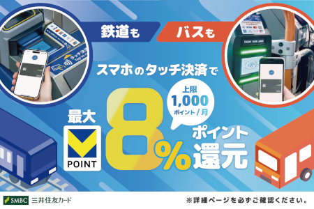 三井住友カードは、対象カード限定で、「スマホのタッチ決済」で対象の鉄道やバスに乗車すると最大8%ポイント還元する「スマホのタッチ決済乗車で最大8%還元!」を4月13日に開始した。
