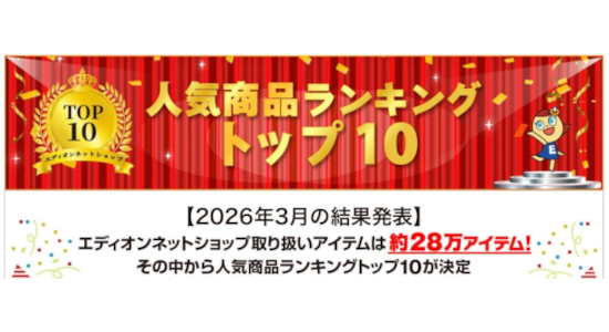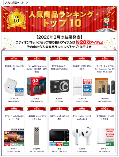 【「エディオンネットショップ」最新ランキング】 約28万アイテムを取り揃える「エディオンネットショップ」で公開されている、「人気商品ランキングトップ10」から注目の商品を紹介します。